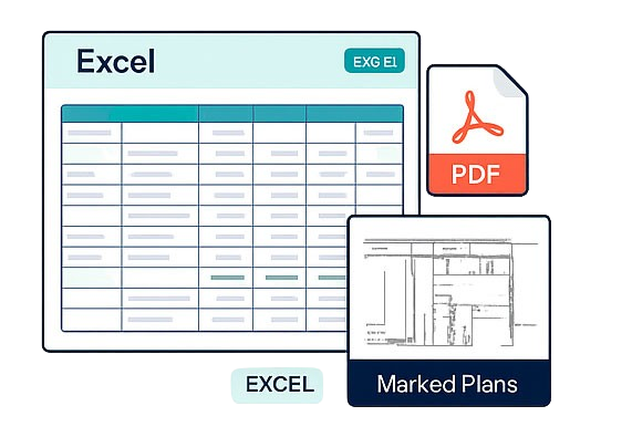 Excel (tabs for Summary, Takeoff by CSI, Assumptions) + PDF, with optional marked plans to support internal review and vendor pricing.